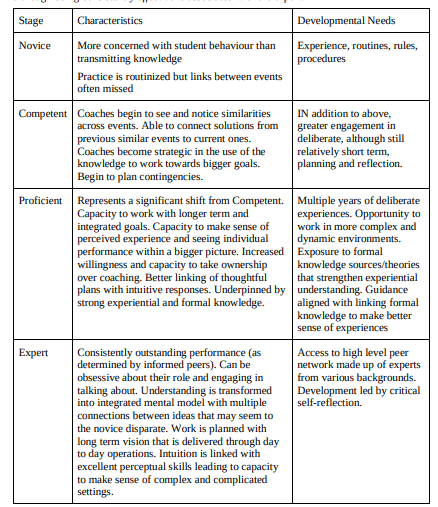 Abraham et al (2010) identify 6 knowledge sources for expert coaching. These are: