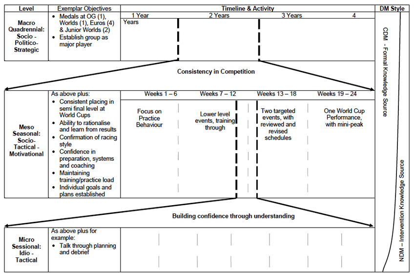 Ultimately, these macro, meso and micro-goals within the nested plan form the basis of PJDM. When making a classical decision in planning Long and medium-term goals for the team, declarative and procedural knowledge will be drawn from these contextual macro and meso goals, along with the other knowledge domains. Likewise, when planning a session, knowledge will be drawn from these contextual micro goals.