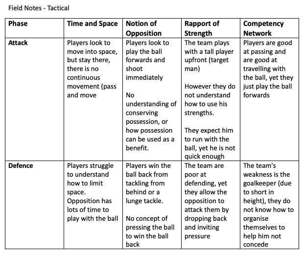 Well, this can be done via a needs analysis of the players using this external criteria. This can and is usually done through observation through various methods (field notes, performance profiles, skill checklist, physical tests, psychological behavioural checklists). I’ll add a few examples of these at the bottom of this blog!