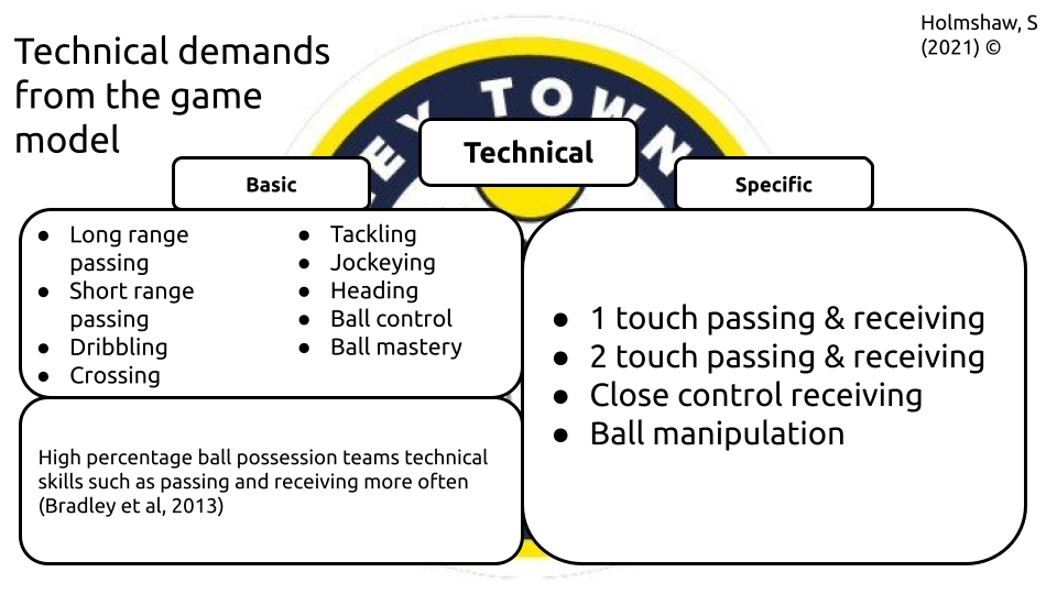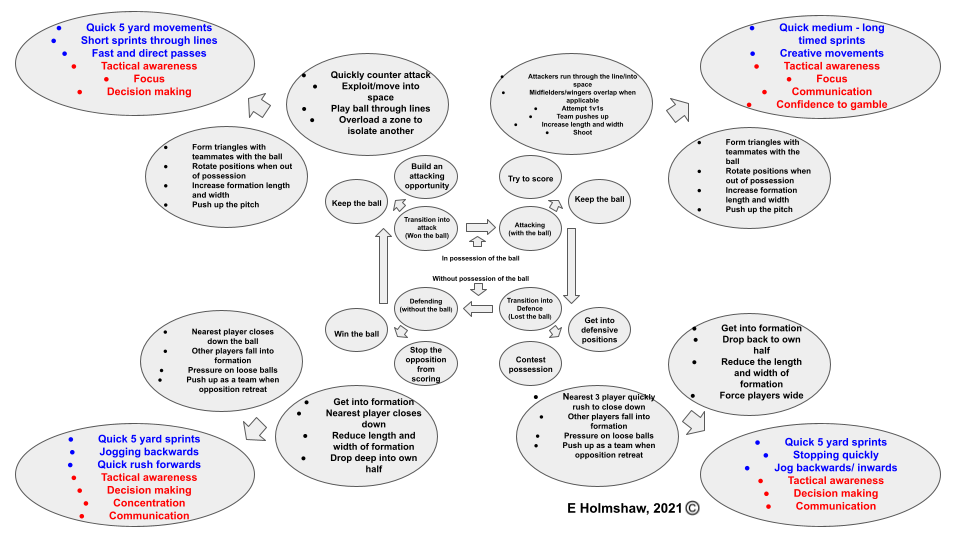 What Mike means here, is that in order to be able to perform that tactical solution (Front 4 get forwards quickly & get ready to receive), they need to be able to perform the technical requirements (passing & receiving, and any demands from following actions, shooting technique to be able to attempt to score for example), psychological requirements (confidence, game awareness, emotional control) and physical requirements (speed, aerobic endurance, strength, power). To be able to perform just one tactical decision and action alone, requires several demands in all the other holistic areas.