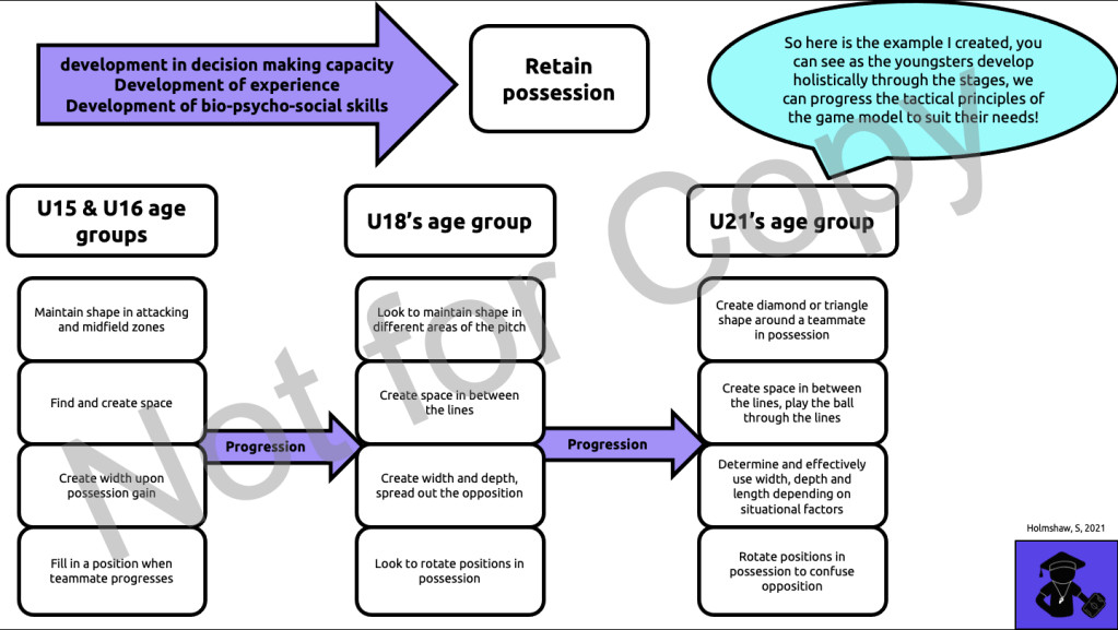 Where an ‘uncontextualised’ or ‘pre-contextualised’ GAME model can become quite dangerous is when we build the model up from the professional team we have seen, and then we put that straight into our U13’s team that we are coaching at the weekends. If coaches are directly training their youngsters these tactical principles, or rather expecting the players to perform these principles, then that’s where there is a real issue here! Evidently, players in the junior game are no where near the level players in the senior game, so there is no way we can expect players to perform the tactical, technical, psychological or physical demands associated with these principles. This is a real misconception of these GAME models, we have to remember where we built these models from, otherwise we are pushing players to perform tactical decisions & actions that they are never going to be able to perform!