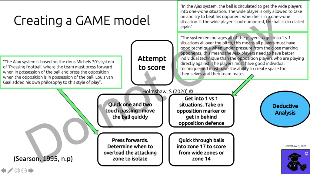 The game model presents ‘tactical solutions’ for each sub-phase of the game! For example in my GAME model, one of the tactical solutions for the players to maintain possession is ‘to create a diamond or triangle around a teammate in possession’.