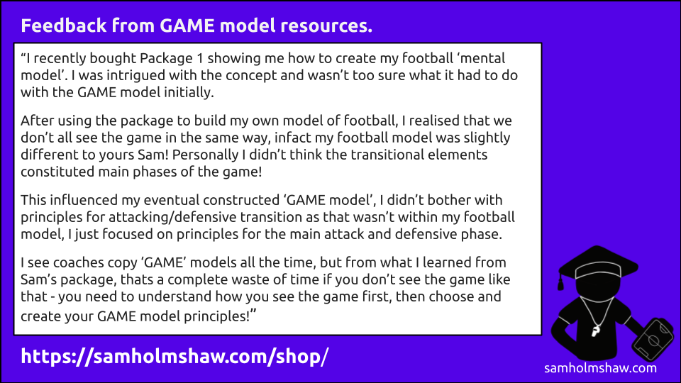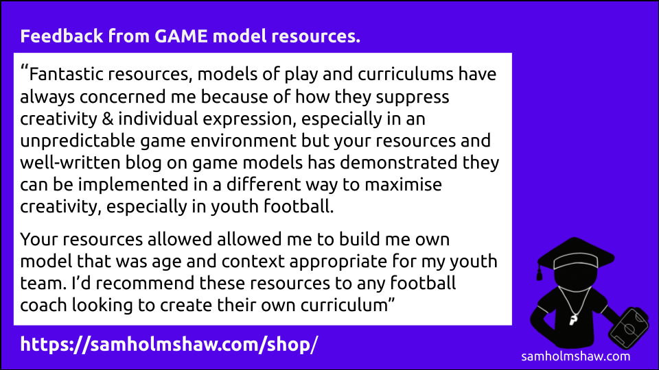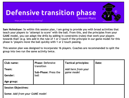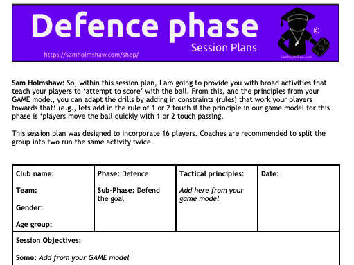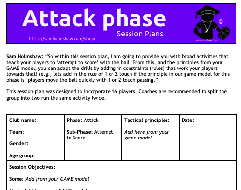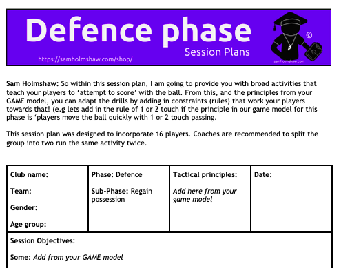 I have created 8 session plans, each session plan is based on one of the 8 sub-phases of the game from my mental model of football. These sessions plans are ‘starting guides’, not complete session plans! They simply provide a starting point to teach players the sub-phases of the game (for example, how to build an attack).