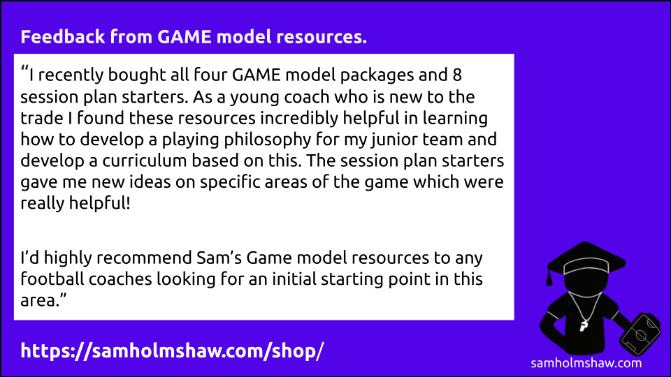 Each session plans includes 4 broad activities based on the sub-phases of the game (to teach the players the concept). These actives can be expanded upon by you as the coach using your GAME model & knowledge of your context! You can add constraints (rules) that tailor the activities to the tactical principles of your GAME model and towards your context (age/stage/ability of the group).